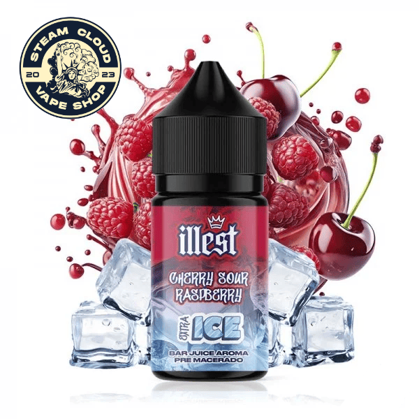 El Aroma Cherry Sour Raspberry Extra Ice Illest 5ml (Mini Longfill) es una combinación intensa de cereza dulce y frambuesa ácida, acompañada de un potente efecto ice que aporta una sensación fresca y muy marcada en cada calada.